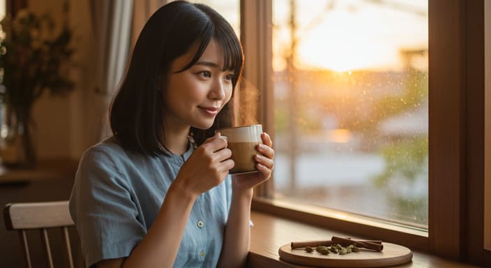 お気に入りのマグカップで、湯気と香りに包まれながら、ゆっくり一息。カップを両手で包み込むと、立ちのぼる香りが一日の疲れをやさしく癒してくれます。