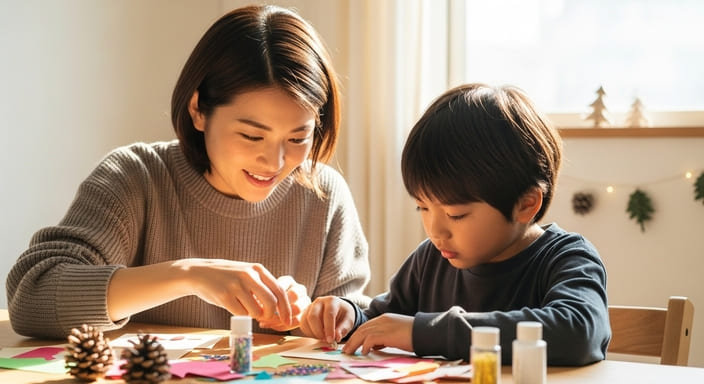 カード・寄付・手作りなど心の贈り物へ。例えば、親子でクリスマスカードを書いて遠くの友だちや大切な人に送ったり、子どもと一緒に小さな寄付をしたり、近所の人へ手作りお菓子を届けるのも素敵です。