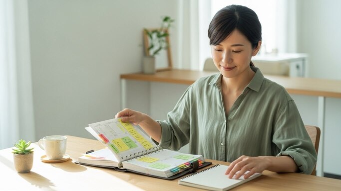 この方法は、毎日きれいに書くことや、完璧な習慣化を目指しません。代わりに重視するのは、“これからの3ヶ月を、どんな状態で過ごしたいか”という暮らしの設計図です。3ヶ月という期間は、長すぎず短すぎず、気持ちと現実のズレを調整するのに最も扱いやすい長さ。だからこそ、無理なく続き、途中で立て直すこともできます。