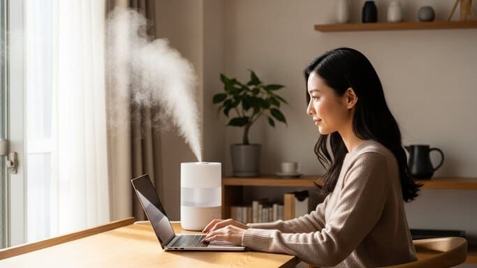 冬は暖房の使用によって室内の空気が乾燥しやすく、実際の室温以上に寒く感じてしまうことが少なくありません。特にリモートワークでは長時間同じ空間にいるため、乾燥による不快感が蓄積しやすく、知らず知らずのうちに集中力を奪っていきます。湿度と空気の流れを意識的に整えることで、同じ室温でも体感的な暖かさは大きく変わり、無理に暖房の設定温度を上げなくても快適に過ごせるようになります。この章では、冬のリモートワーク環境を内側から支えてくれる「空気環境」に注目し、快適さと集中力の両方を高めるための考え方とアイテムを紹介します。