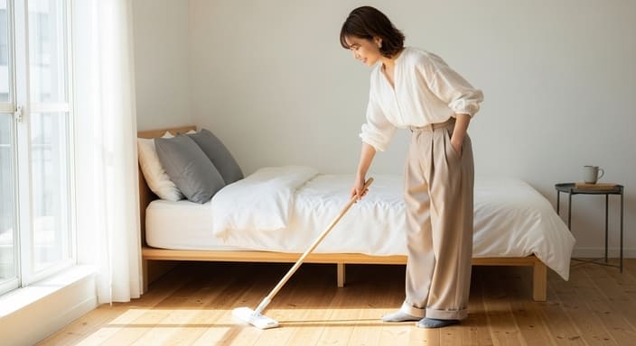 「やらなくていい」と言われても、やっぱり少し気になる。頭では理解できても、ふとした瞬間にベッド下のホコリを思い出してしまうことは珍しくありません。そんなときは、無理に気合を入れるのではなく、労力をできるだけかけない方法だけを選びましょう。ここで大切なのは、「ちゃんとやる」よりも「少しでも気が済む」ことです。ポイントは、最初から“完璧を目指さない”と決めておくことにあります。