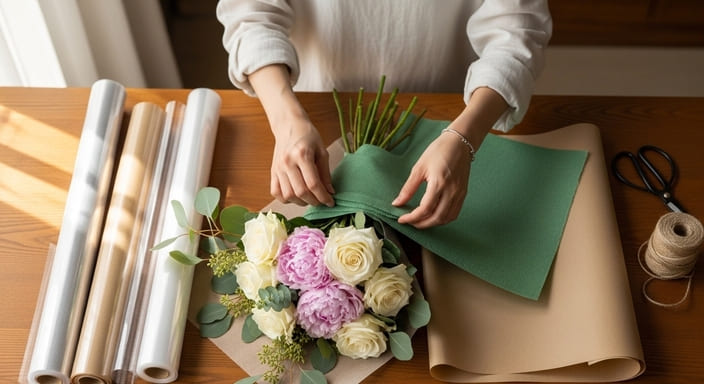 素材は不織布・OPP・クラフトの三本柱を基準に選べば、シーンに合わせた調整がしやすく、大きな失敗は避けられます。