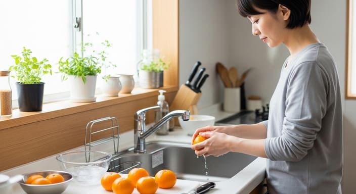 まずは、みかんをよく洗い、表面についた汚れやホコリを落とします。皮ごと使う方法なので、このひと手間をかけておくと、後で安心して食べられます。次に、水気をしっかり拭き取ったら、1個ずつラップに包むか、まとめて保存袋に入れて冷凍庫へ入れるだけです。
