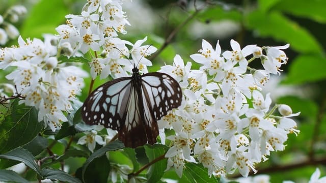 岐阜県山県市神崎では、標高約500mの林道沿いに咲くタニウツギの花にアサギマダラが集まります。