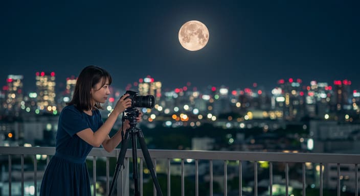 水面に映る月を狙えば幻想的な二重の光景を収められ、街並みや樹木をシルエットにすれば物語性が一層増します。